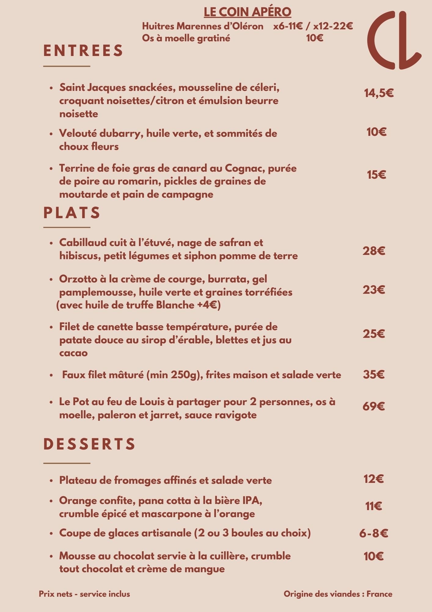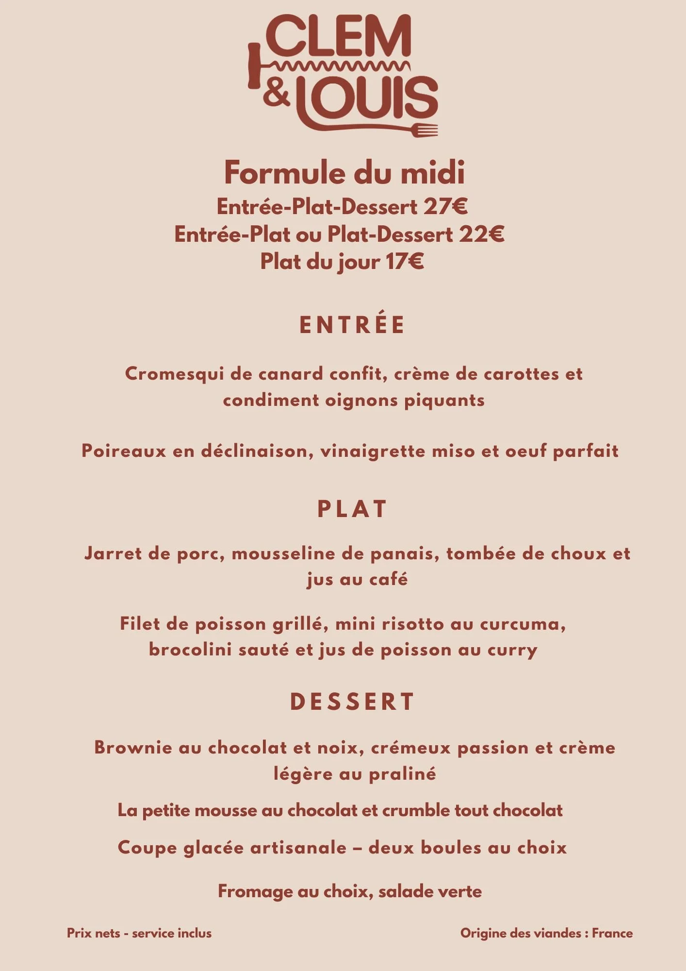 Clem&Louis vous propose une cuisine généreuse et créative, élaborée à partir de produits frais et de saison.
